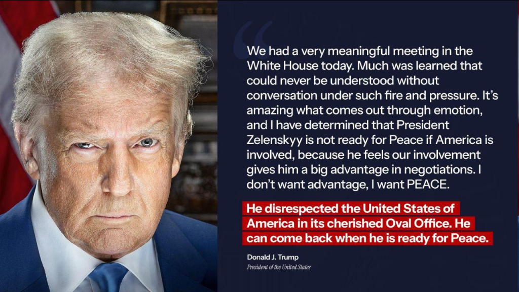 ትራምፕ ከዘለንስኪ ጋር የጋለ ንግግር ካደረጉ በኋላ በትሩዝ ትስስር ገጻቸው ላይ ” ዘለንስኪ ለሰላም ዝግጁ አይደለም። ለሰላም ሲዘጋጅ ተመልሶ መምጣት ይችላል ” ብለዋል።