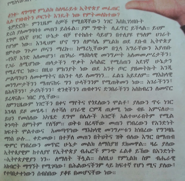 በፌስቡክና ትዊተር ላይ የታየው ፎቶ ላይ ቴዲ አፍሮ ‹‹ምኒልክ ኢትዮጵያን አንድ ለማድረግ ያደረጉት ጦርነት ለእኔ ቅዱስ ጦርነት ነው›› ብሎ እንደተናገረ ተደርጎ ቀርቧል፡፡ እውነተኛው ላይ ደግሞ ‹‹አመጣጡን ያየ አካሔዱን ያውቃል›› ይላል፡፡ ገርሞኝ የውስጠኛውን ቃለምልልሱን አገላበጥኩ፡፡ ከውስጥ ያለው ስለጦርነቱ የቀረበለት ጥያቄ ላይም ‹‹ቅዱስ ጦርነት›› የሚል ፈልጌ አጣሁ፡፡