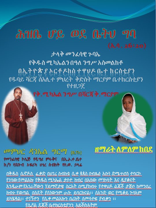 - "የዱባይ ቅዱስ ሚካኤል የኢትዮጵያ ኦርቶዶክስ ተዋሕዶ ቤተ ክርስቲያን" በሚል ጉባኤ ለማካሄድ የተዘጋጁት አካላት ሕገ ወጥ መሆናቸው ተገልጧል፤