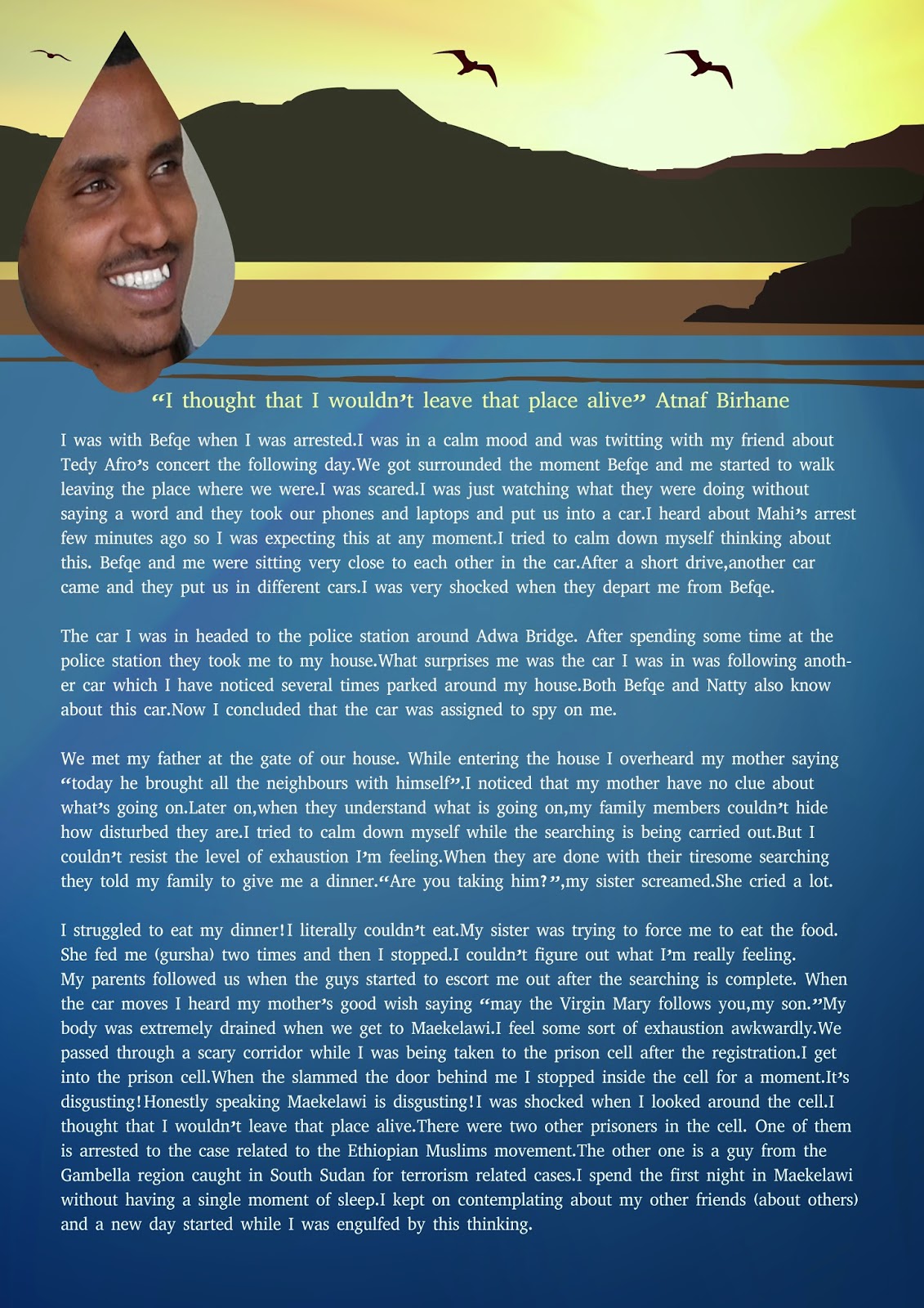 I was with Befqe when I was arrested. I was in a calm mood and was twitting with my friend about Tedy Afro’s concert the following day. We got surrounded the moment Befqe and me started to walk leaving the place where we were. I was scared. I was just watching what they were doing without saying a word and they took our phones and laptops and put us into a car. I heard about Mahi’s arrest few minutes ago so I was expecting this at any moment. I tried to calm down myself thinking about this. Befqe and me were sitting very close to each other in the car. After a short drive, another car came and they put us in different cars. I was very shocked when they depart me from Befqe.