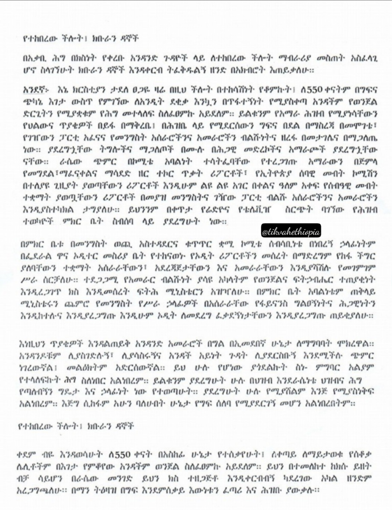 “ለ550 ቀናትም በግፍና ጭካኔ እገታ ውስጥ የምገኘው ለአንዲት ደቂቃ እንኳን በጥፋተኝነት የሚያስቀጣ አንዳችም የወንጀል ድርጊት የሚያቋቁም የህግ መተላለፍ ስለፈጸምኩ አይደለም። የአማራ ሕዝብ የሚያነሳቸውን የህልውና ጥያቄዎች በይፋ በማቅረቤ፣ በሕዝቤ የሚደርሰውን ግፍ፣ በደል በማስረጃ በመሞገቴ፣ የገዢውን ፓርቲ አፈናና የመንግስት አሰራሮችንና አመራሮችን ብልሹነትና ዘረፋ በመታገሌ ነው ” ብለዋል።