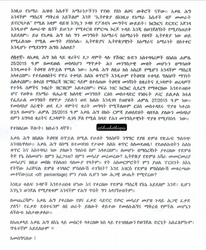 “ ይህ የአቃቢ ህግ ክስ ግን መንግስት ከአማራና ከአማራነት የጸዳች ኢትዮጵያ ነው ወይ የሚፈልገው ? የሚል ሙግት ያስነሳል። ኢትዮጵያና ኢትዮጵያዊነት ከአማራና ከአማራነት በስተቀር እንዲሆኑ የሚደነግግ ህግስ አለ ወይ? ” ሲሉ ጠይቀዋል።