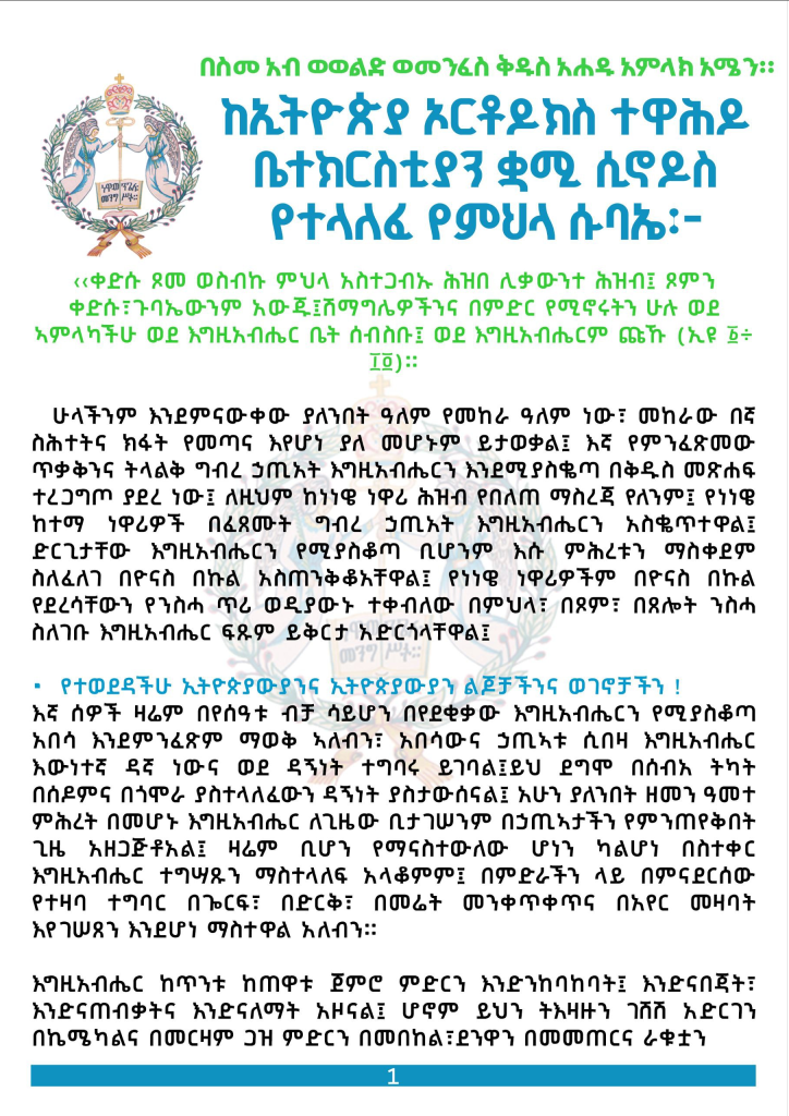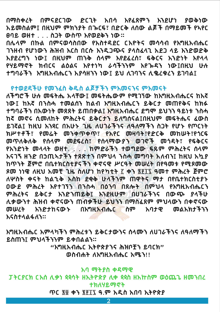 ብፁዕ ወቅዱስ አቡነ ማትያስ የሰላምና የጸሎት አዋጅ መግለጫ ሰጥተዋል።