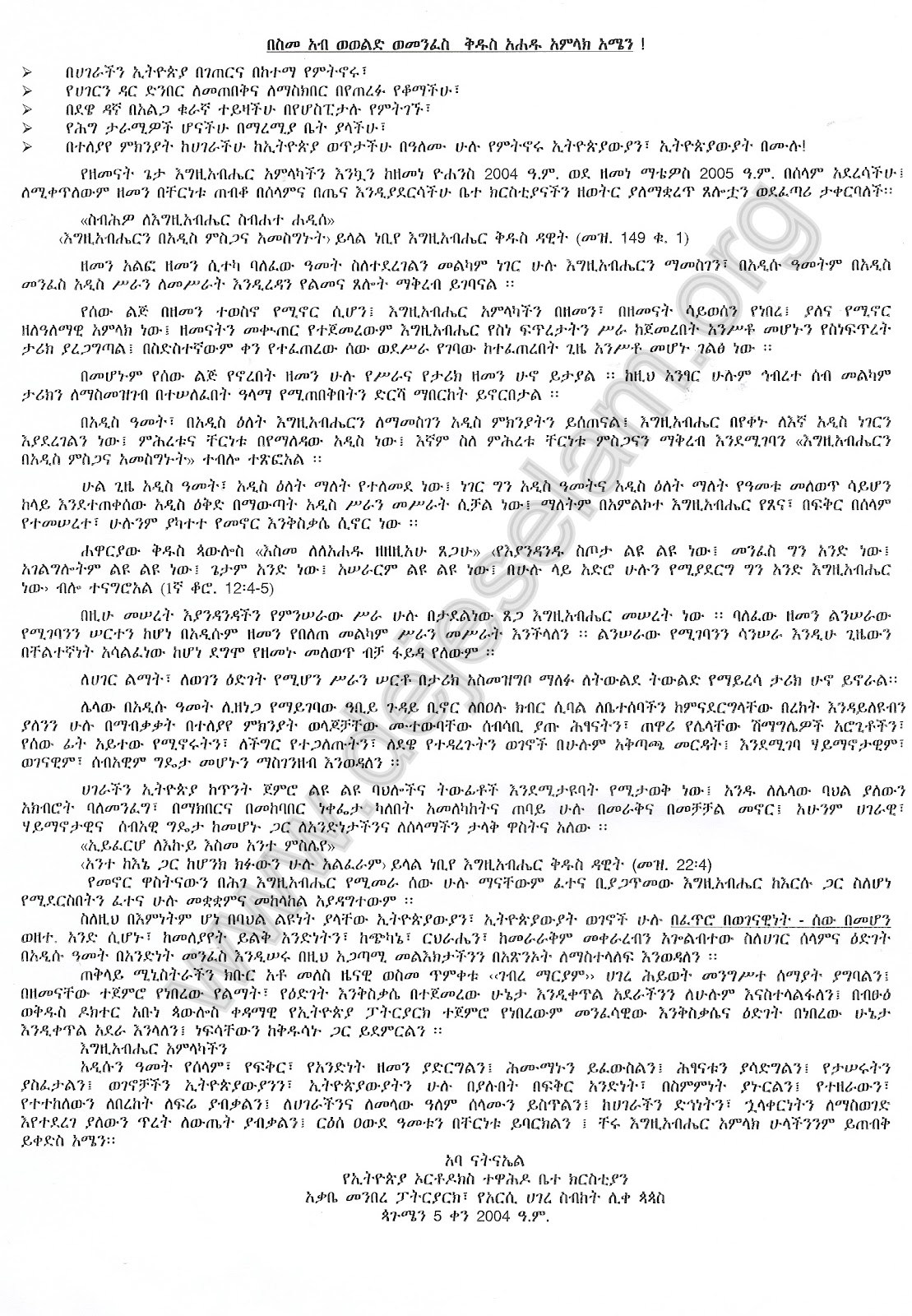 2005 ዓ.ም በሰለማም አደረሳችሁ፤ ለሚቀጥለውም ዘመን በቸርነቱ ጠብቆ በሰላምና በጤና እንዲያደርሳችሁ ቤተ ክርስቲአናችን ዘወትር