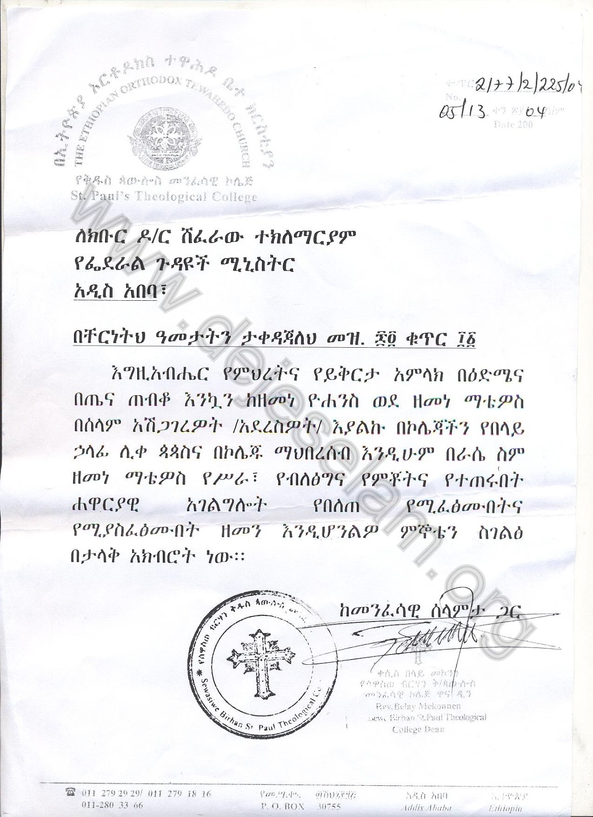 እምነት ተከታይነታቸው ለሚታወቁ አንድ ከፍተኛ የፌዴራል መንግሥቱ ባለሥልጣን (የፌዴራል ጉዳዮች ሚኒስቴር ሚኒስትር ዶ/ር ሺፈራው ተክለ ማርያም) የጻፉት የእንኳን አደረስዎ ደብዳቤ ከአዲስ ዓመት መልካም