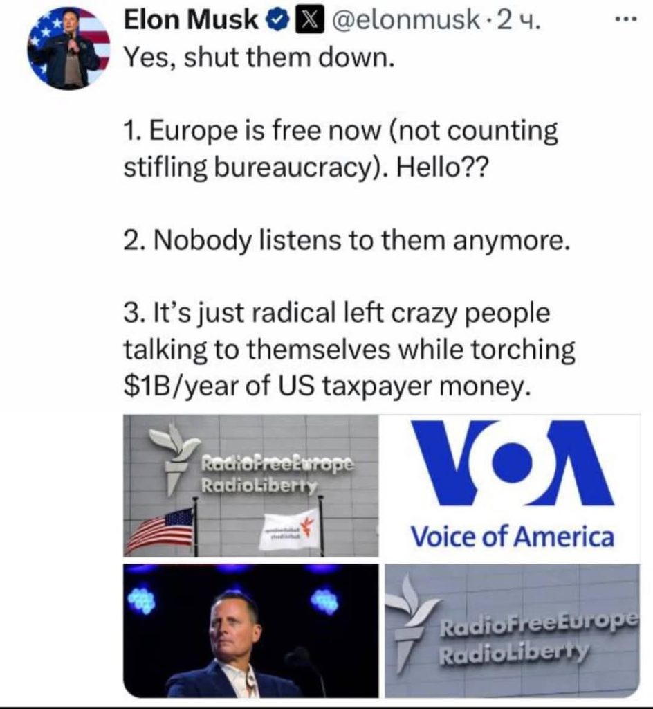 በአዲሱ የመንግሥት ተቋመትን አፈጻጸም የሚገመግመውና በርካታ ውሳኔዎችን እያስተላለፈ የሚገኘው Department of Government Efficiency እያሥተዳደሩ የሚገኙት ኤሎን መስክ የአሜሪካ ድምፅ ሬዲዮ እንዲዘጋ በኤክስ ገጻቸው ሀሳብ አቅርበዋል።
