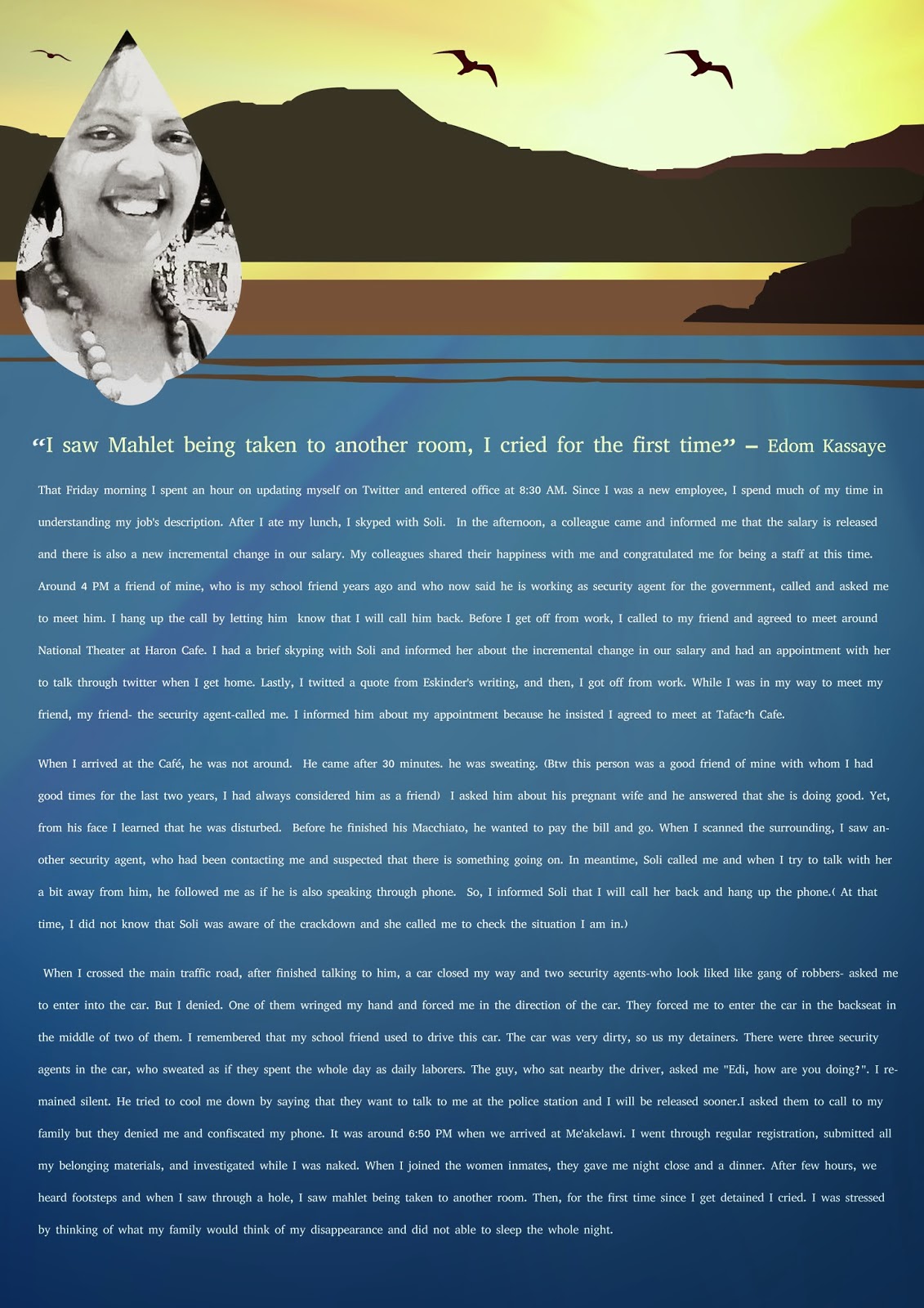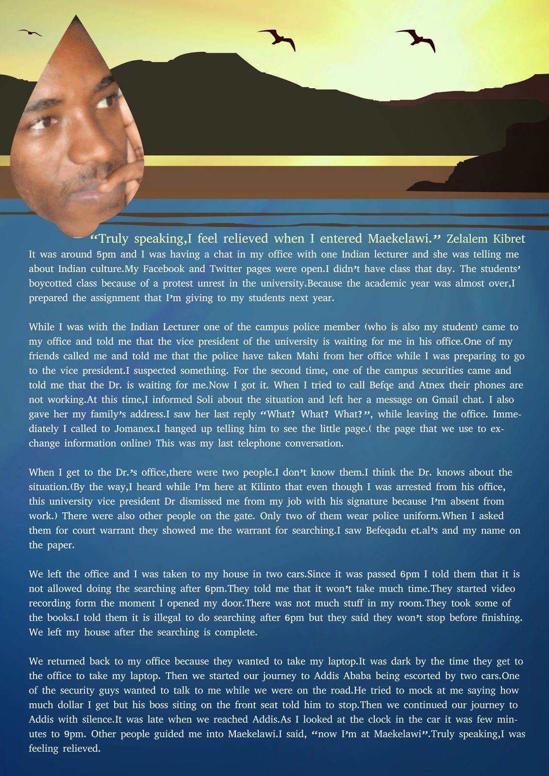 Hundreds of days back out of the blue I was arrested for a suspicion of felony, that eventually turned to be a crime of preparation and conspiracy to commit an act of terrorism. However, the charge was not a simple matter as I mentioned. Rather, I passed through a prolonged medieval-like ordeal or as ‘they’ called it ‘interrogation’. Finally I end up in a remand center which have thousands of ‘detainees -of – conscience’. Even if it is laughable but, the crime that I am accused of is neither bail able nor an easy thing to face. Since I face capital punishment if I fall in the ‘convicted’ basket. So, comrades ain’t my failure to fulfill our promise forgivable?