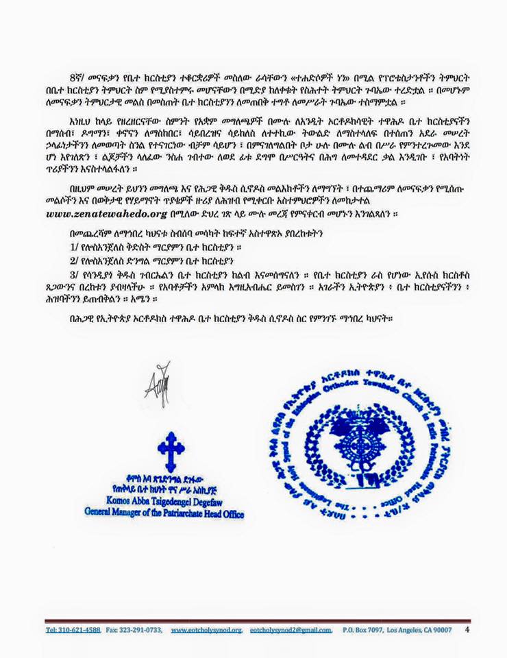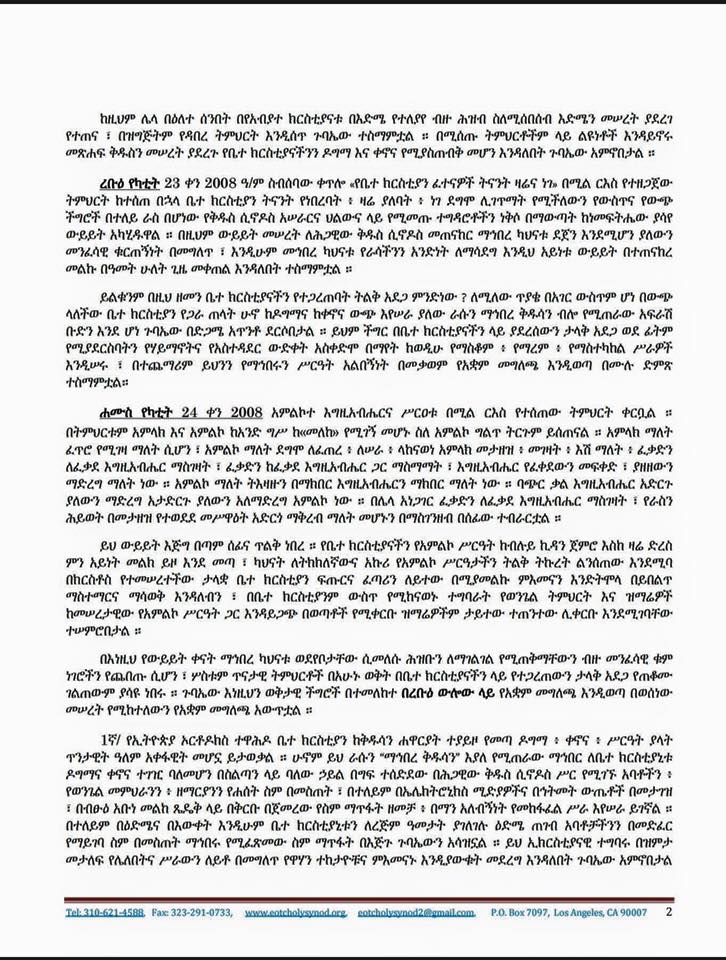 ገኙ አባቶች የሚመራው ቤተ ክህነት አባላት የሆኑ ካህናትም ሰሞኑን ጉባዔ ማድረጋቸውንና የአቋም መግለጫ ማውጣታቸውን አስታውቀዋል (መግለጫውን በመጨረሻ ያገኙታል):: እነዚሁ “ሕጋዊው ቅዱስ ሲኖዶስ” በሚባለውና በ4ኛው ፓትርያርክ በብፁዕ ወቅዱስ አቡነ መርቆርዮስ በሚመራው ክፍል ሥር የሚገኙ ካህናት ያደረጉት ጉባዔ ከየካቲት 21-25/2008 ዓ.ም (ከፌብሩዋሪ 29 እስከ ማርች 4/2016 መሆኑ ነው) ድረስ የተካሄደ መሆኑን “ቆሞስ አባ ጽጌ ድንግል ደገፋው፤ የጠቅላይ ቤተ ክህነት ዋና ሥራ አስኪያጅ” በሚል ፊርማና ማኅተም የወጣው መግለጫ ያትታል። ታዲያ ስለምን ተነጋገሩ? ውሳኔያቸውስ ምን ይሆን?